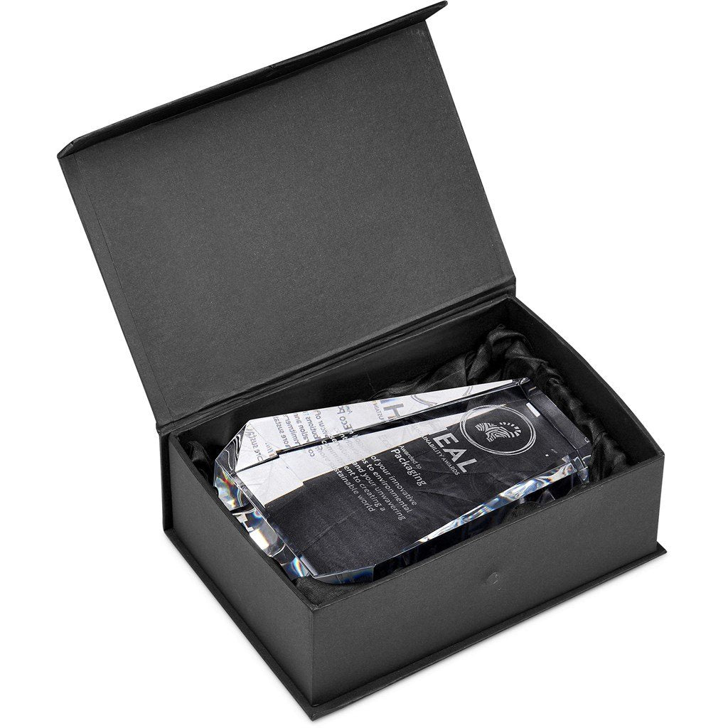 An optical glass award with a large platform for a full colour digital print. Presented in an elegant box with a padded satin lining inner.
