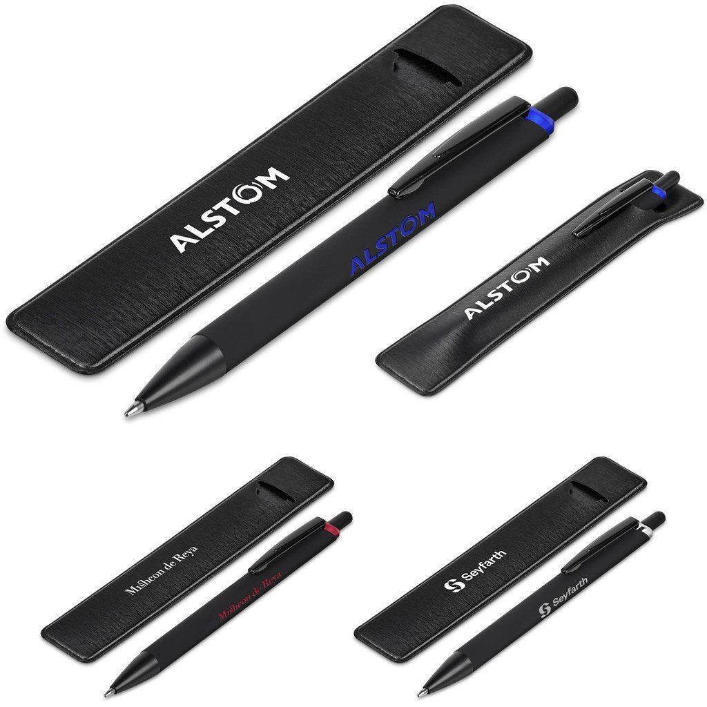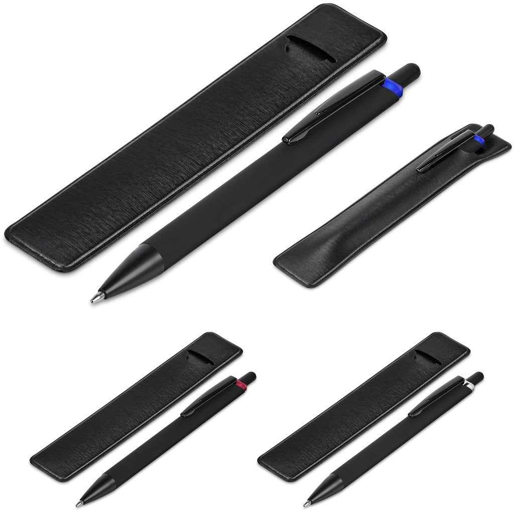 This metal ball pen has a matte black top coating with a chrome underlay. The shiny underlay matches the trim accent of the pen, and is revealed when your logo is engraved on the barrel. The ball pen refill contains good quality, black German ink and will provide smooth, uninterrupted writing for a minimum of 1,500 metres. Presented in a black PU pen pouch.